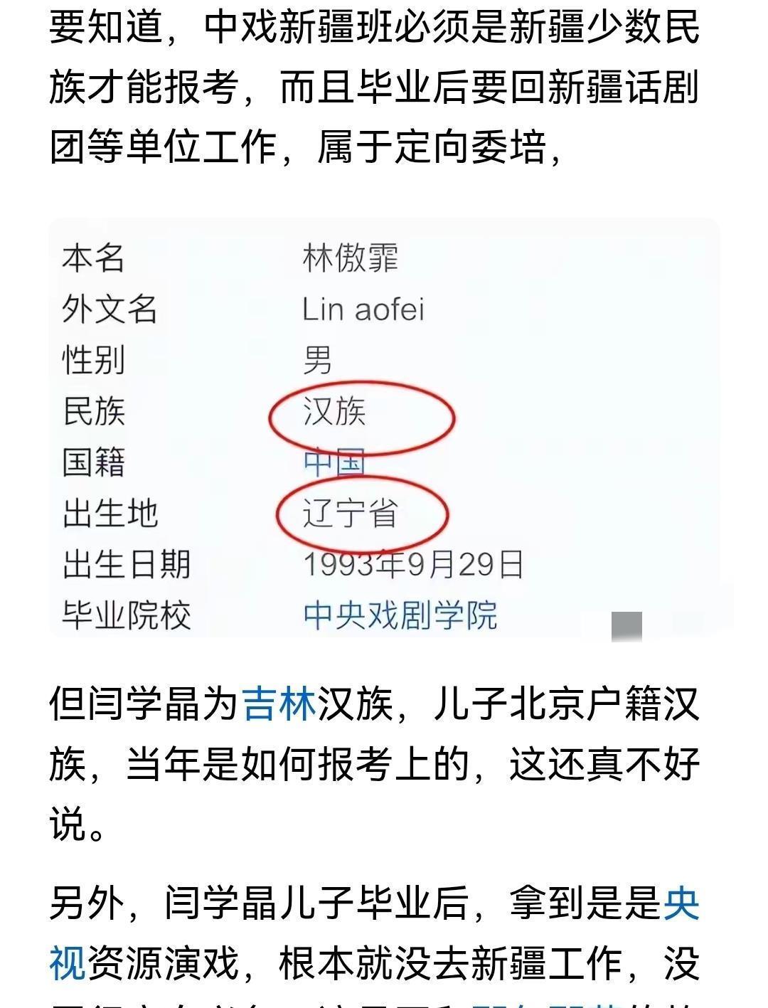 深层争议:教育资源公平性遭质疑事件转向更严肃的公共议题——有网友爆料闫学晶之子林傲霏曾通过中戏新疆班升学。该班级本为新疆少数民族定向培养项目,要求考生户籍、民族符合条件且毕业后返疆工作。但公开信息显示,林家为吉林汉族背景,儿子却以北京户籍入学且未履行定向就业义务。